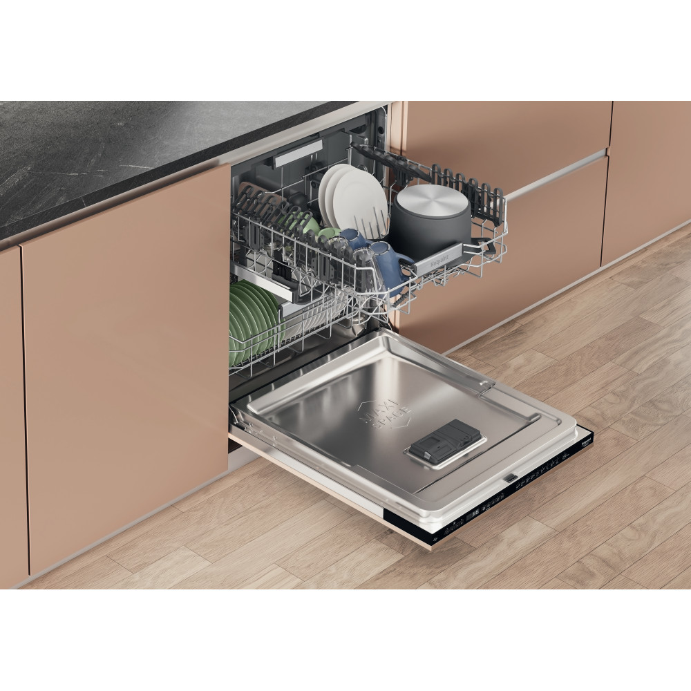 Esta máquina de lavar loiça de encastre Hotpoint tem: máquina de lavar loiça de tamanho standard com capacidade para um grande número de conjuntos. Classe de eficiência energética C. Excecional consumo de água reduzido. Cor preta. Tecnologia inovadora que garante um desempenho extra silencioso, para um eletrodoméstico silencioso.