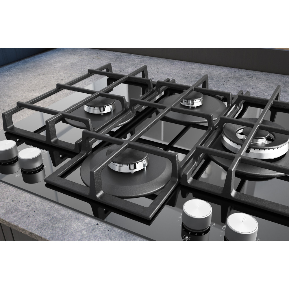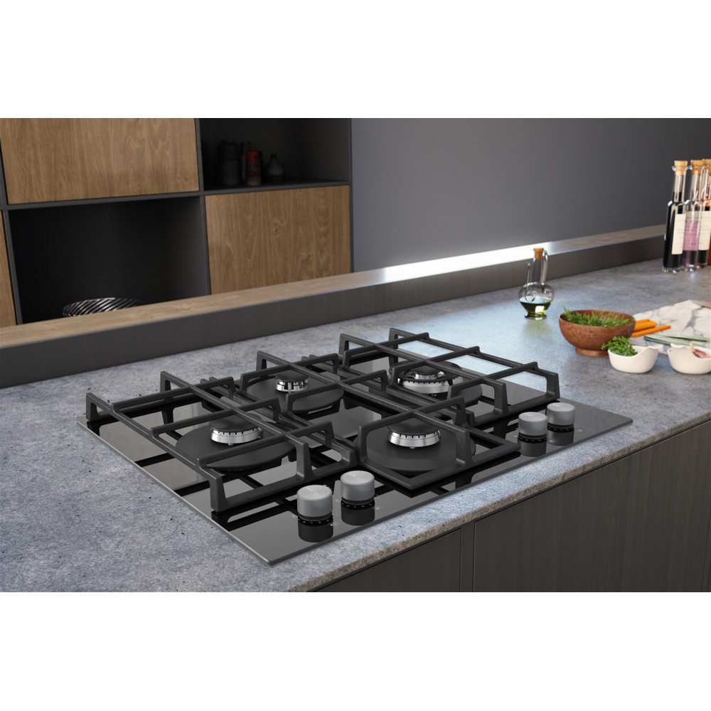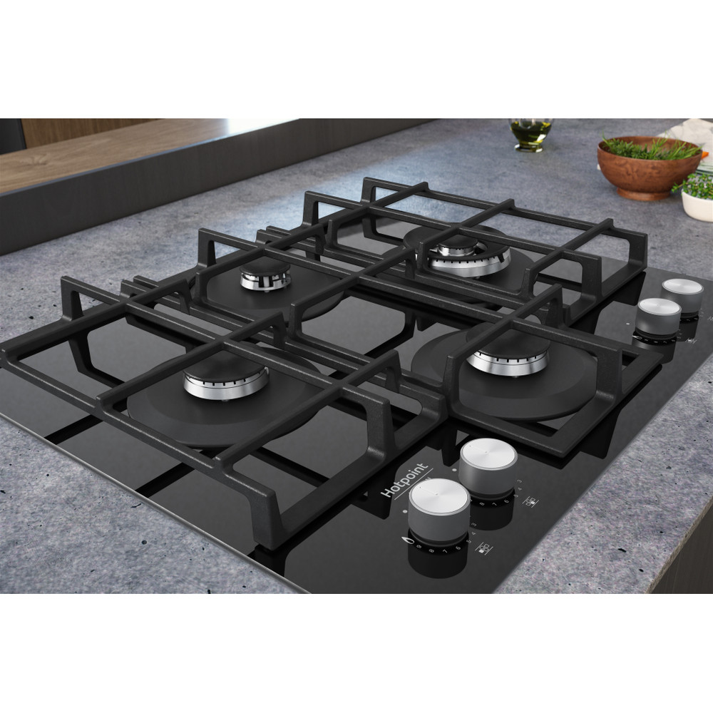 A placa de cozinhar a gás Hotpoint tem uma superfície de vidro elegante, que dá um toque fresco ao estilo da sua cozinha.