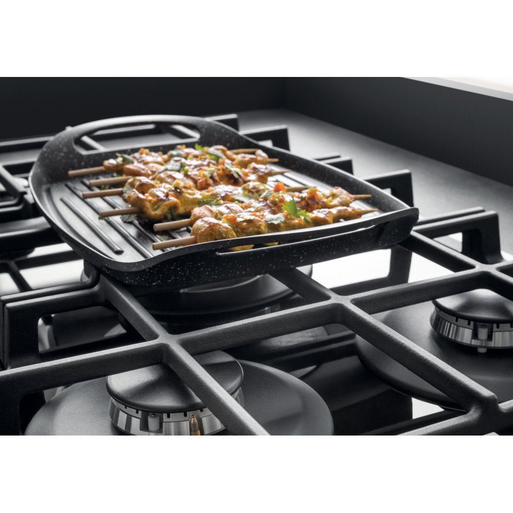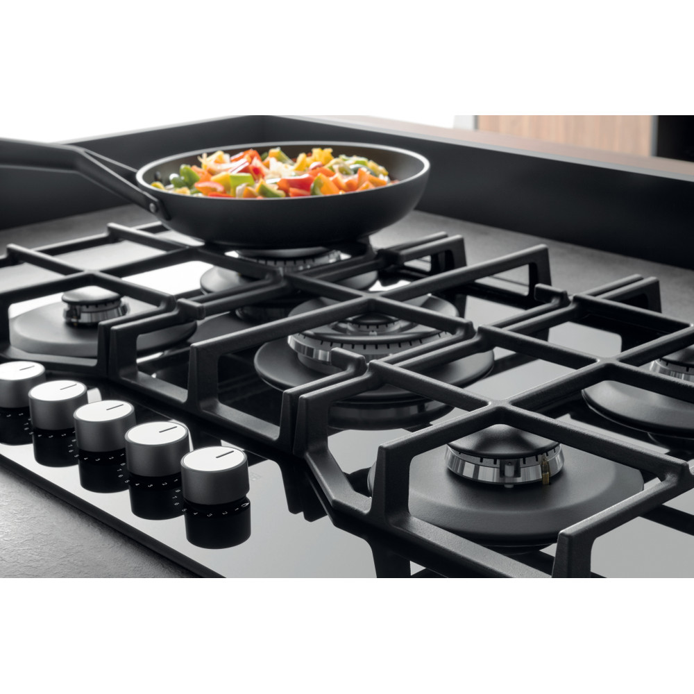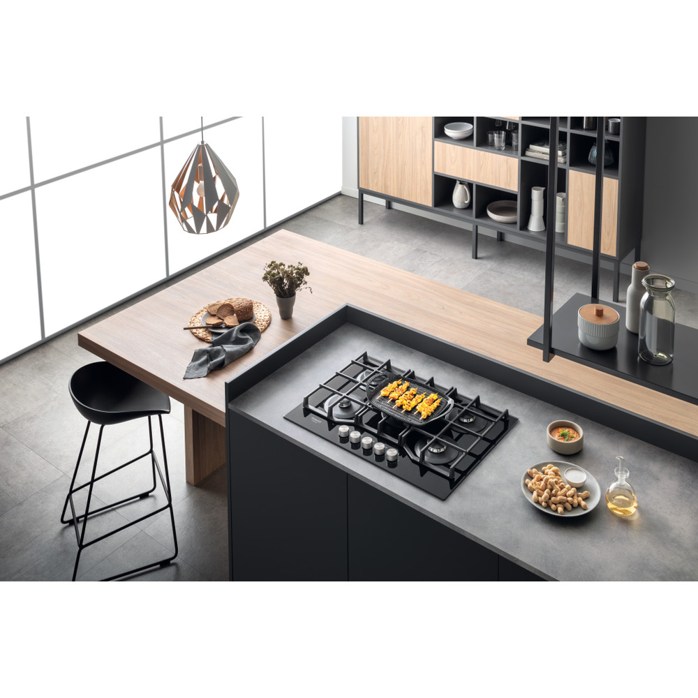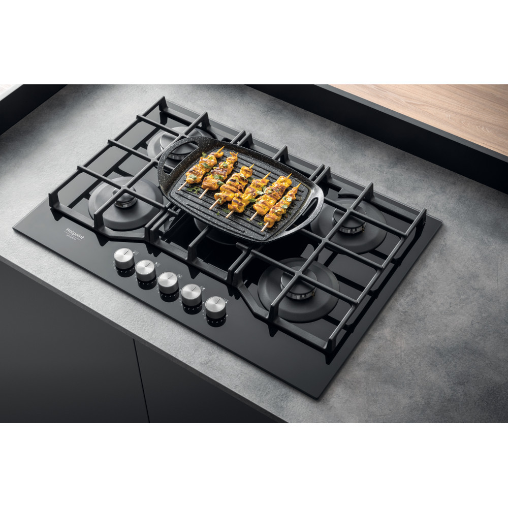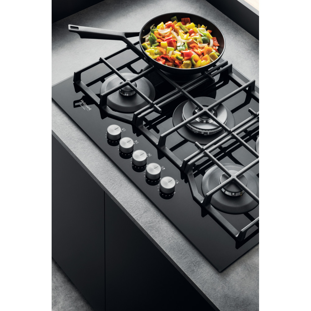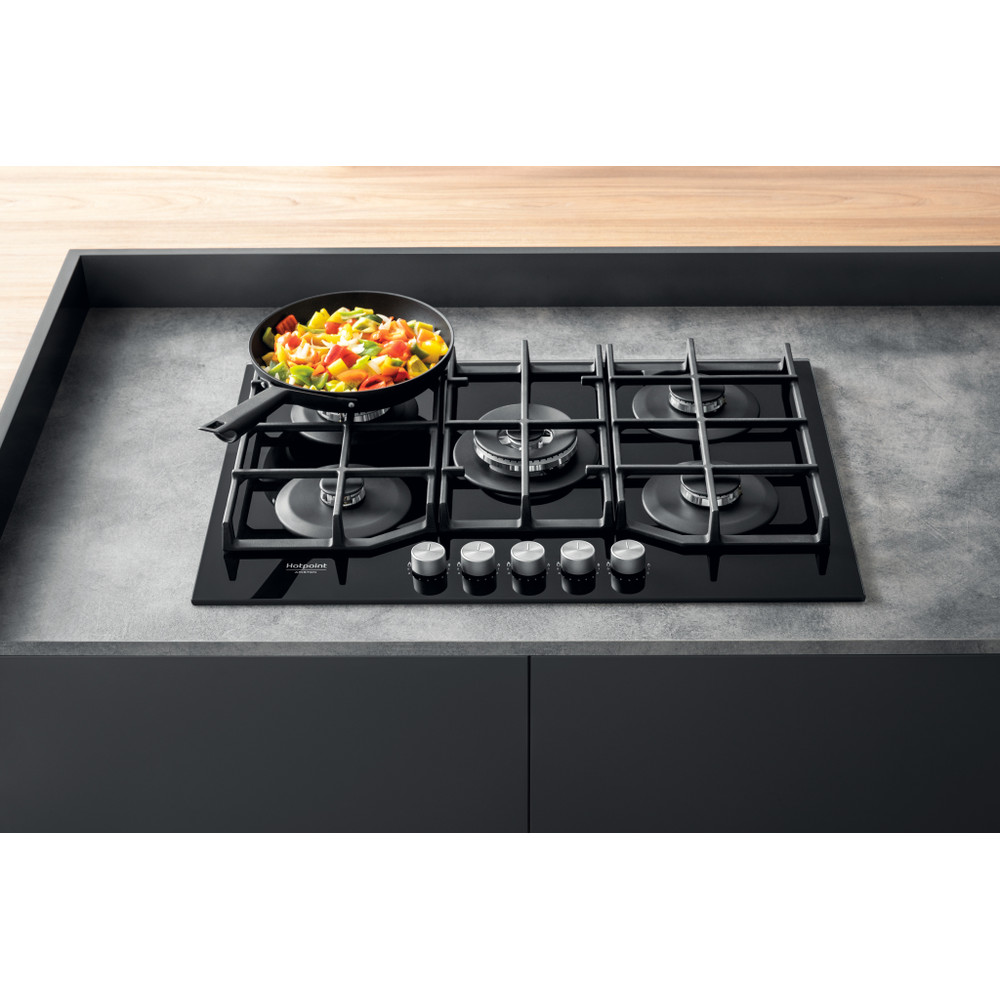 A placa de cozinhar a gás Hotpoint tem uma superfície de vidro elegante, que dá um toque fresco ao estilo da sua cozinha.